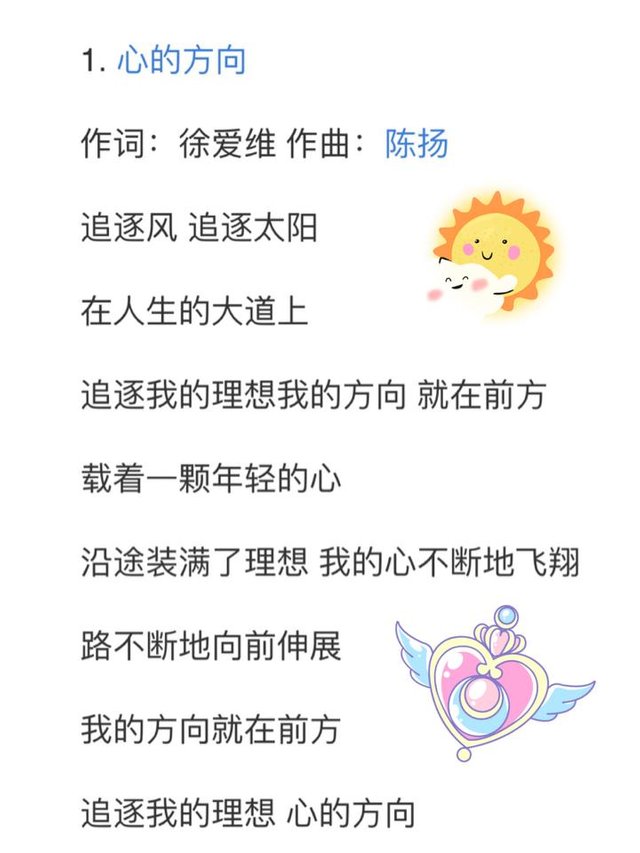 Source: ct.yimg.com 心的方向 周华健 追逐风 追逐太阳 在人生的大道上 追逐我的理想 我的方向就在前方 载着一颗年轻的心 沿途装满了理想 我的心不断地飞翔 路不断地向前伸展 我的方向就在前方 追逐我的理想 心的方向 追逐风 追逐太阳 在人生的大道上 追逐我的理想 我的方向就在前方 载着一颗年轻的心 沿途装满了理想 我的心.